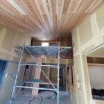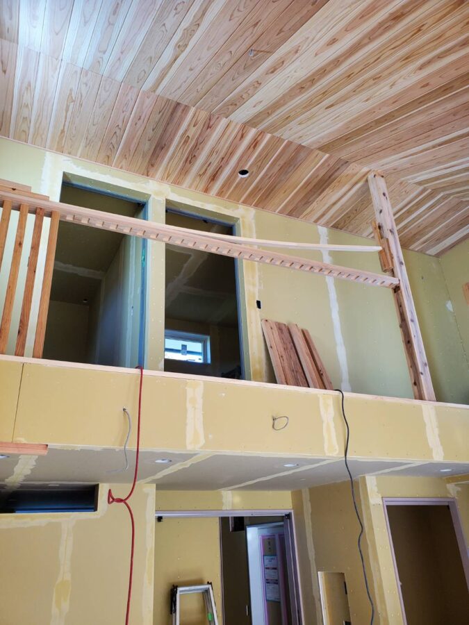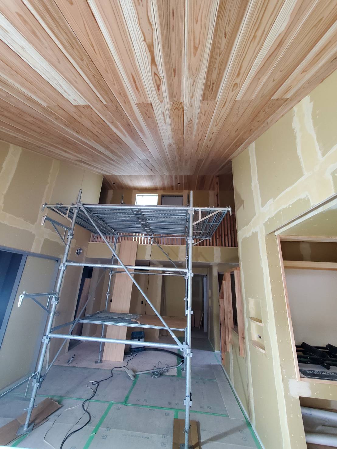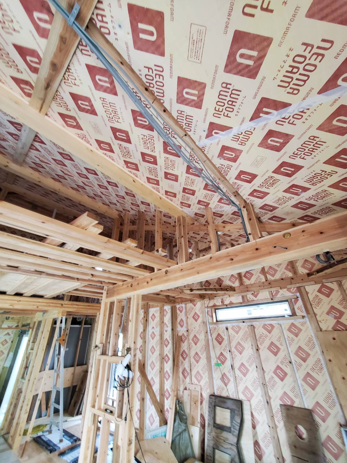 床・壁の断熱材の施工が完了し、天井にも断熱材が入りました✨ クロス下地となるボード貼りまで進んでいます。